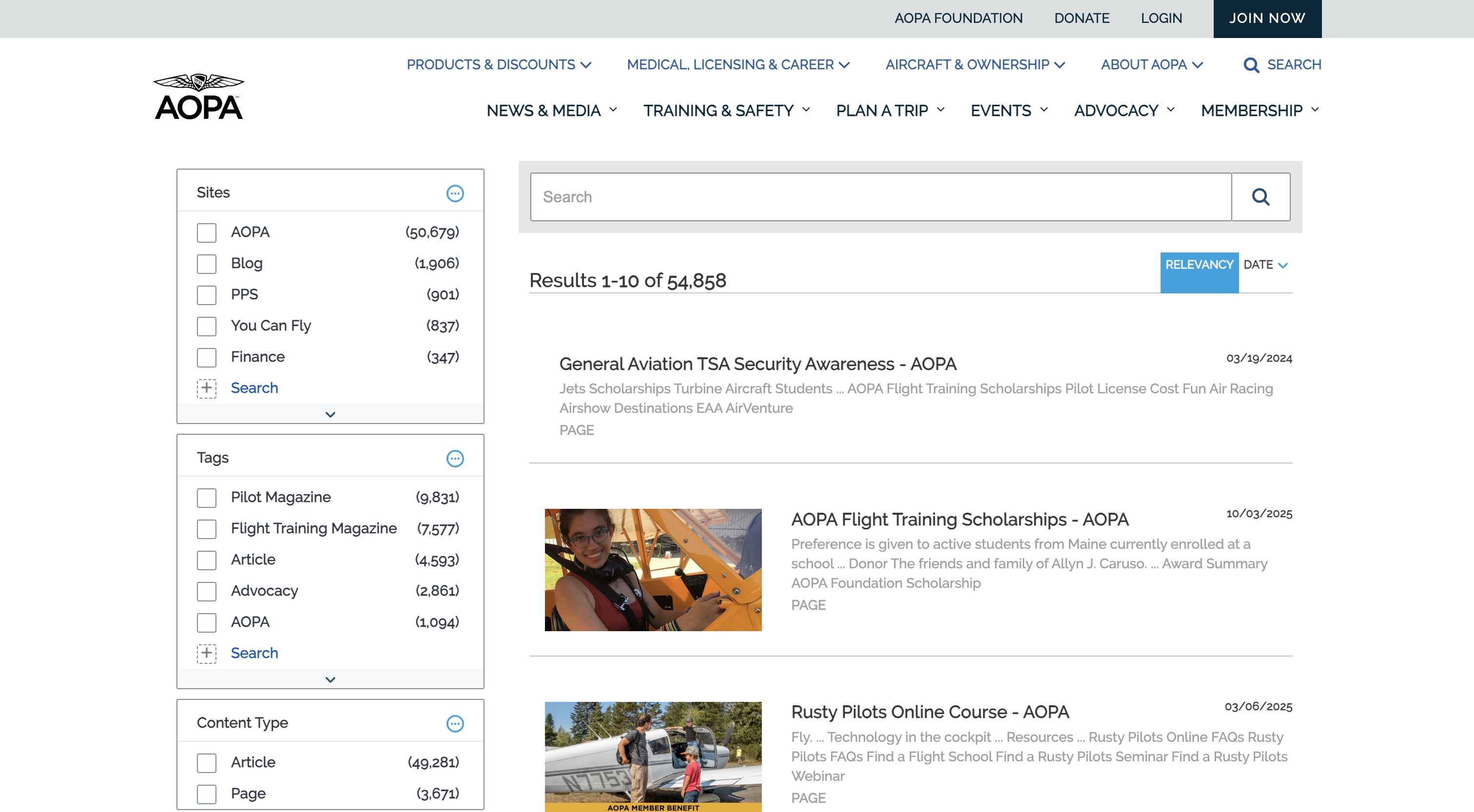 Every website needs a good search page, and the Aircraft Owners and Pilots Association (AOPA) website was no exception. By utilizing Coveo for Sitecore's new Hive Framework, I was able to deliver a search page that made finding their Sitecore content a breeze, via custom facets, search suggestions and auto-corrections.